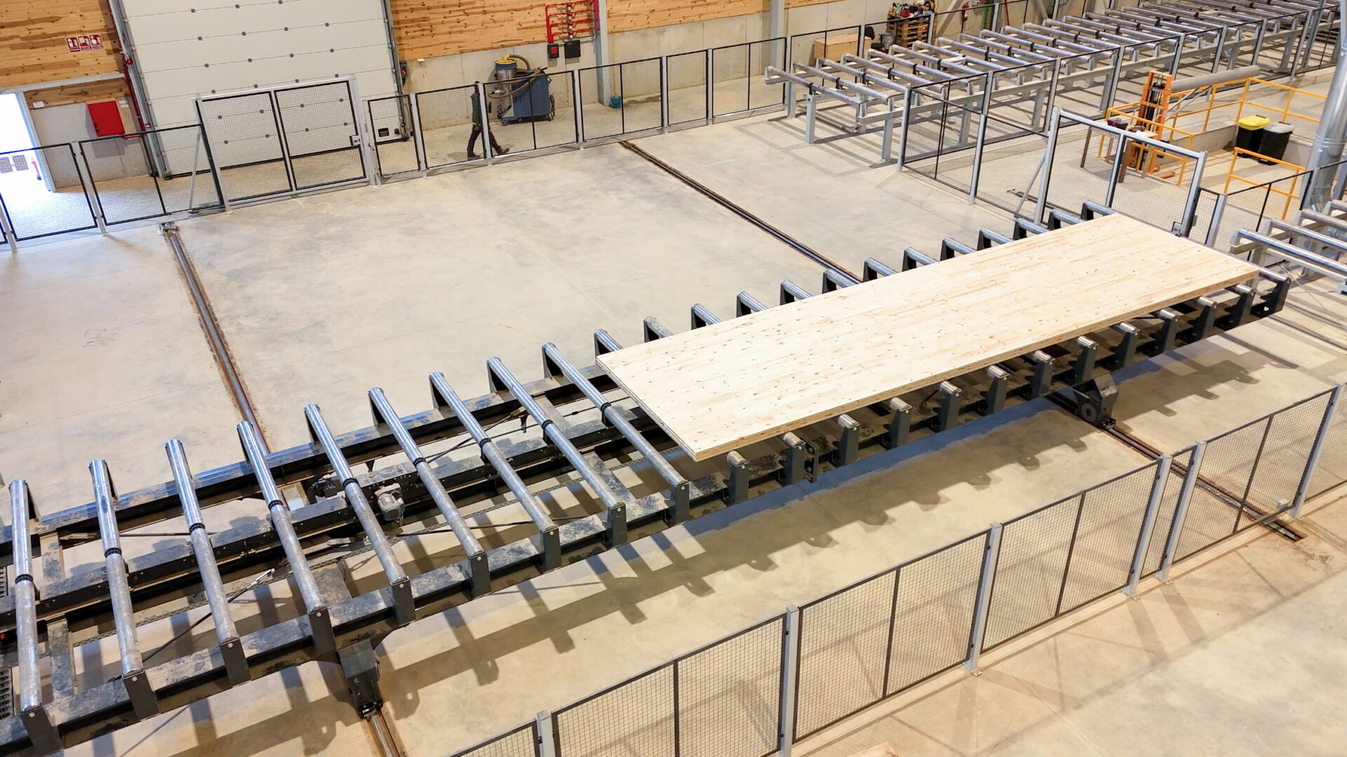 This flexible CLT shuttle system handles the transport of large-format CLT elements. The cross-travel via a floor-level rail system, as well as the central chain drive, enable a smooth, precise, and